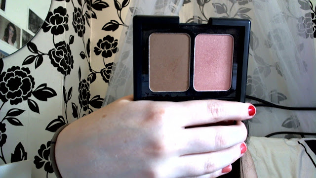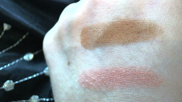 Swatches. I think the bronzer is quite 'shimmery'. I tried to use it this morning and I don't think I will ever use it. I bought this at chance really. I'm not a huge fan of the 'bronzed' look. I have never faked tan'd in my life, let alone owned a bronzer. I do like the look of defined cheek bones. I just think mine are non-existant! I will try to work with this product again one day, but I think I'll steer clear from trying to enhance my non existant cheekbones! The blush is lovely though. A really pretty pink which looks very pretty on the apples of the cheeks.