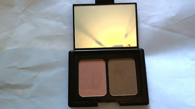 The blush is a very lovely dusty pink. It's a dupe for NARS blush in Orgasm.