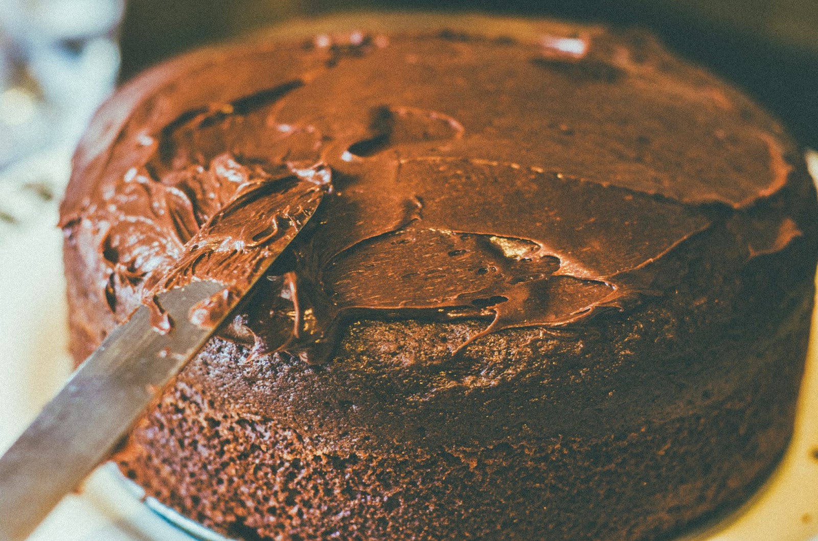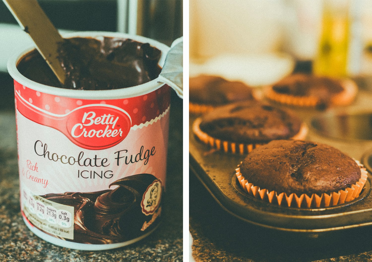 Now it's the fun bit! Time to ice! Using the Chocolate Fudge Icing* by Betty Crocker, the consistency is really creamy if kept at room temperature. I used a butter knife to spoon out the icing and spread it out evenly. I did this for the cupcakes and the cake making sure I did the sides of the cake too!