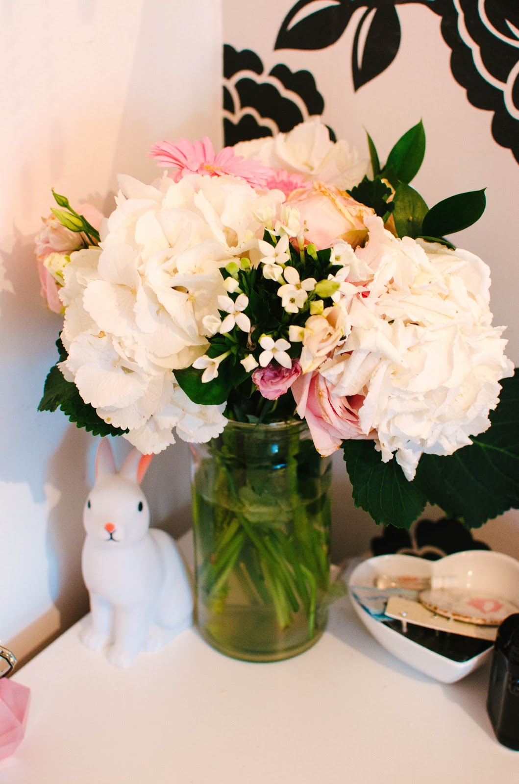It was really hard choosing a bouquet to review because they are all so lovely but the Strawberry Smoothie bouquet from the Summer range stood out the most. It features beautiful, fluffy white hydrangeas and dusty pink avalanche roses which look so pretty in my black and white bedroom.