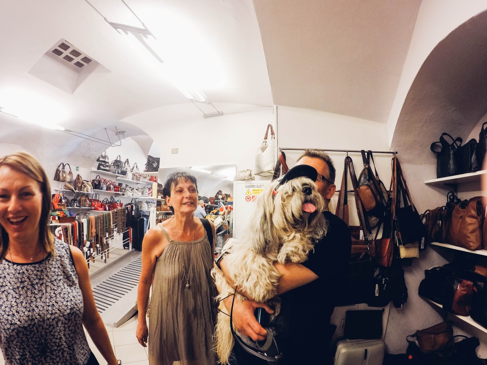 There was lots of leather shops as you can imagine just about everywhere in Italy. When we looked in this one, we found a dog with a cap on looking super duper cool!