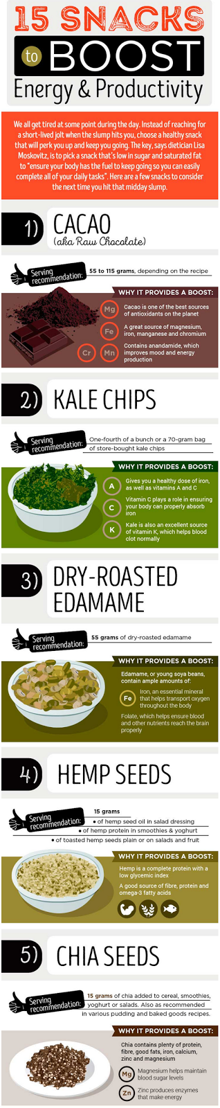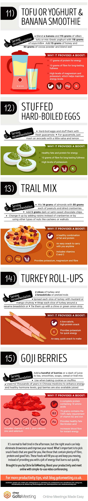 Today, I have an interesting and informative piece that I thought you might be interested in! Go To Meeting have shared 15 snacks that help to boost energy and productivity. I shall definitely be trying some of these foods!