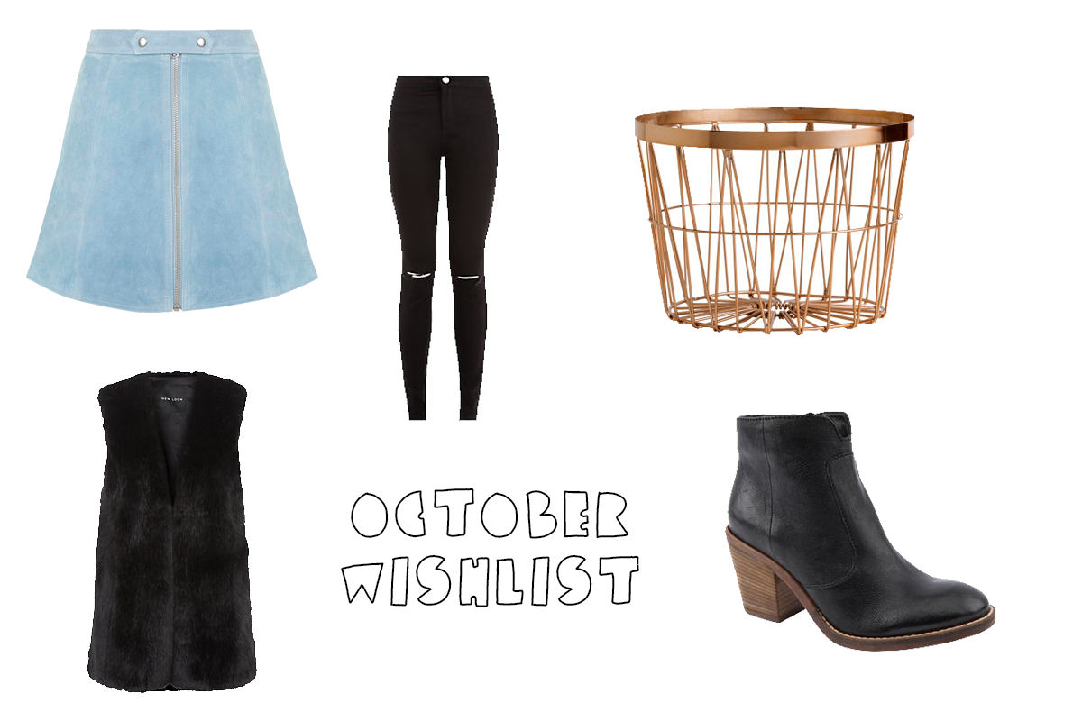 I love the blue skirt, you don't often see that shade of blue for a suede skirt. Wire baskets are currently very 'on trend', especially the copper ones. I work on the Homewares floor in a department store and they are everywhere. As for the ankle boots, I have something very similar that l bought from Office at the start of the year, and they are brilliant, especially if you are walking in the snow!