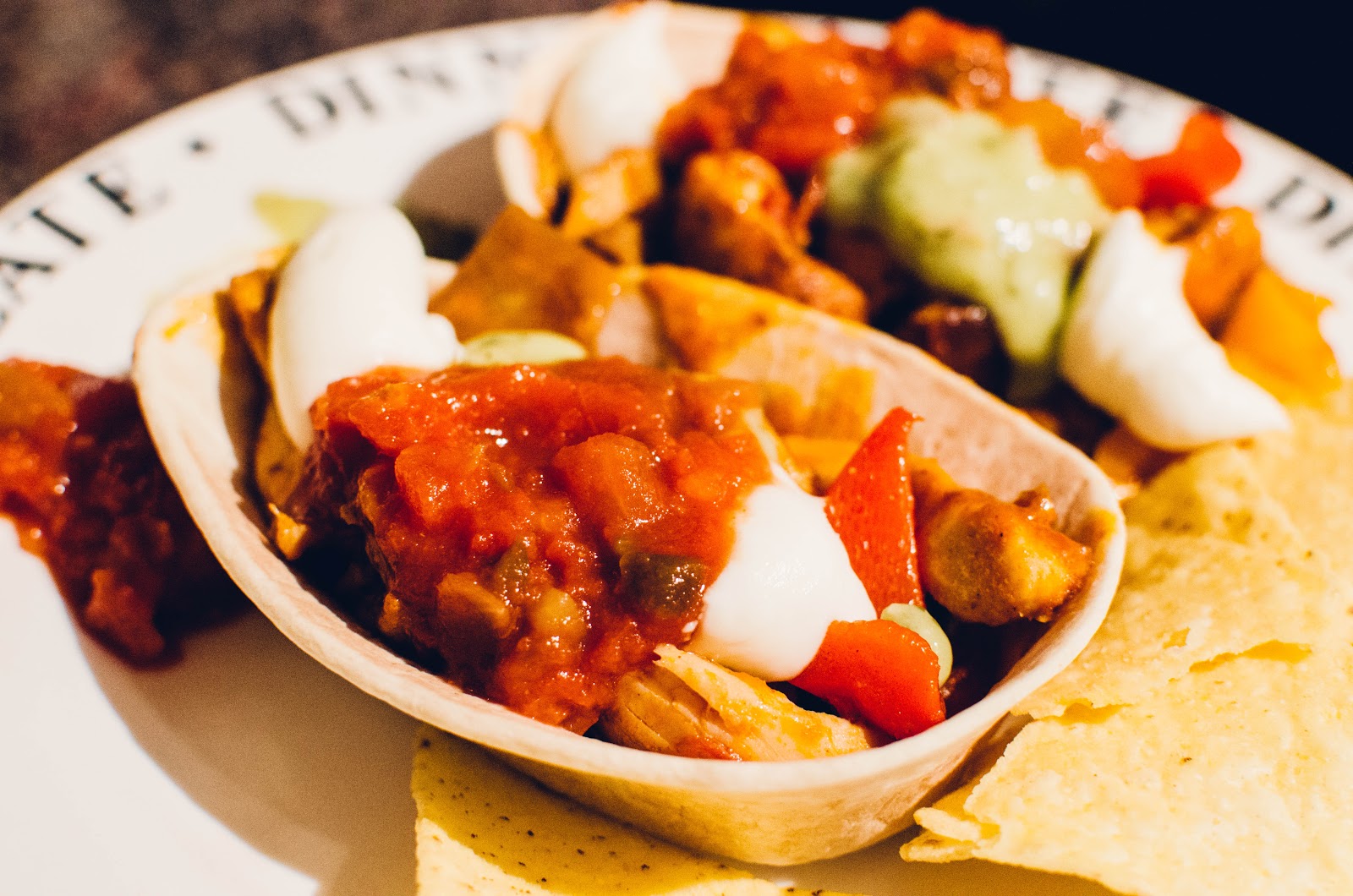 Making boats is super easy. Just heat up the tacos in the microwave for 20-30 seconds, add the cooked chicken mixture, add your toppings and then lots of cheese on top for an extra bit of Mexican naughtiness! We even found we had some tortilla chips at home to accompany the boats.