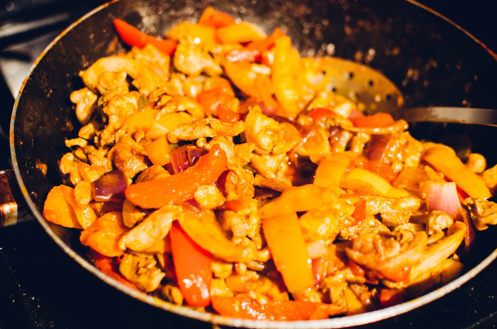 Time to cook the chicken, add the sauce, cut the peppers and mix it all together.