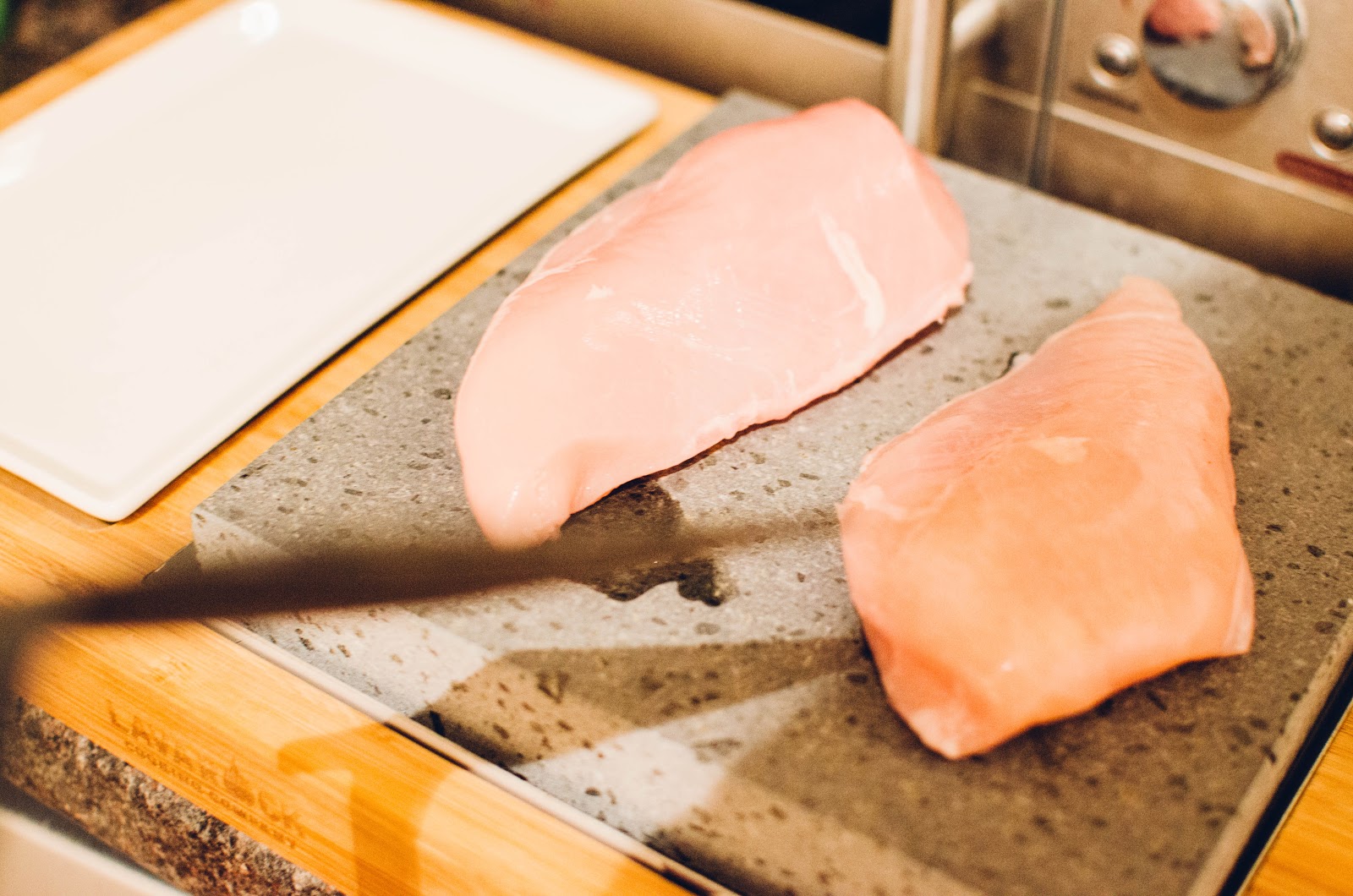 After heating up the lava cooking rock in the oven (and being VERY careful when handling it when hot), I started by cooking my chicken breasts. Immediately, they began cooking and it made handling chicken a little bit more fun. I usually get so grossed out cooking chicken breasts! It didn't take long for them to cook at all!