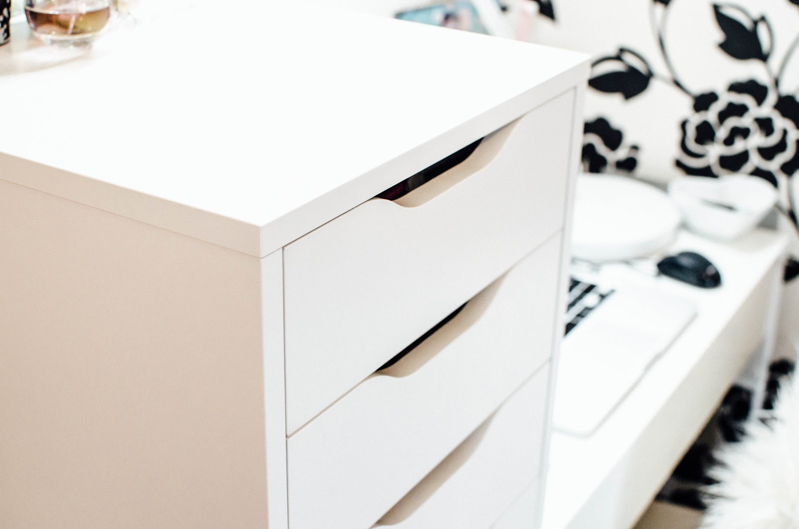 My storage is much more organised now. Base makeup and lip products live in the first drawer, eye makeup and pallets in the second, skin care in the third and underwear in the next two drawers. In the deep drawers, I have a drawer full of socks and one dedicated to PR samples. Then there's one for PJ's and finally the bottom drawer has my hair heat tools in. I store my actual hair products in different a different storage system.