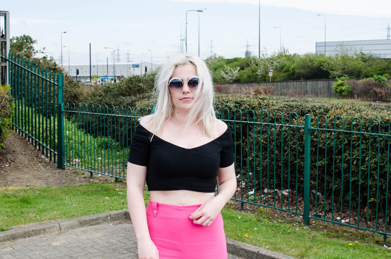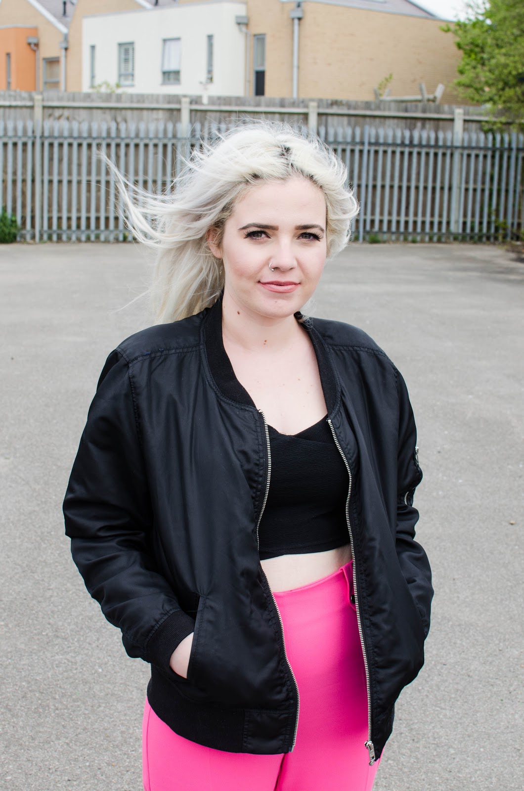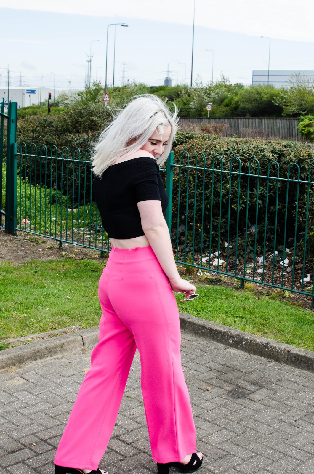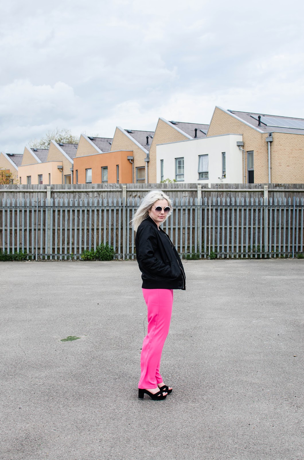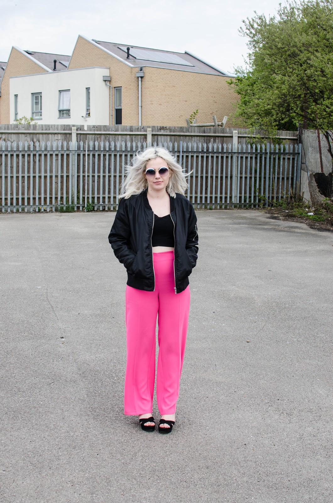 They have a super flattering high waisted and wide leg fit which is my absolute favourite in trousers. The bubblegum pink is certainly in your face but teamed with a black bralet top from Primark, a black bomber jacket from H&M and some black platforms to finish everything off nicely.