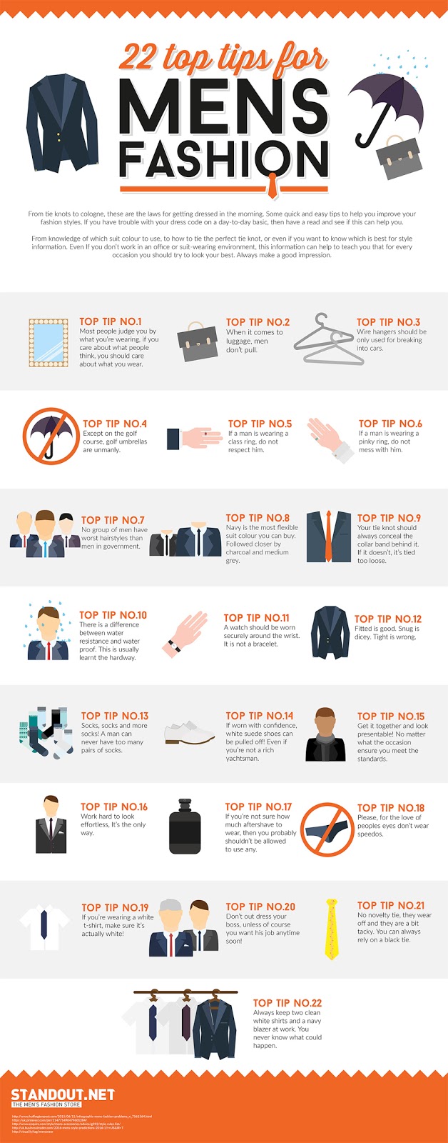 Standout.Net have put together a guide of simple fashion tips which you can apply to your everyday style. Most men wear simple outfits but a lot of men arer now starting to take pride in their appearances This handy tips guide features 22 different tips for men ranging from how to tie the perfect knot in a tie and how to make a good first impression with your personal style.