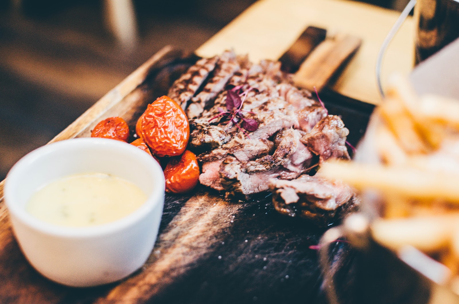 A 28 days matured rib eye steak from Mother's farm in Scotland was presented on a chopping board with a pot of Bearnaise sauce, roasted baby tomatoes and two silver tin pots of fries. One was plain fries and one was truffle fries - again; absolutely amazing for choices!