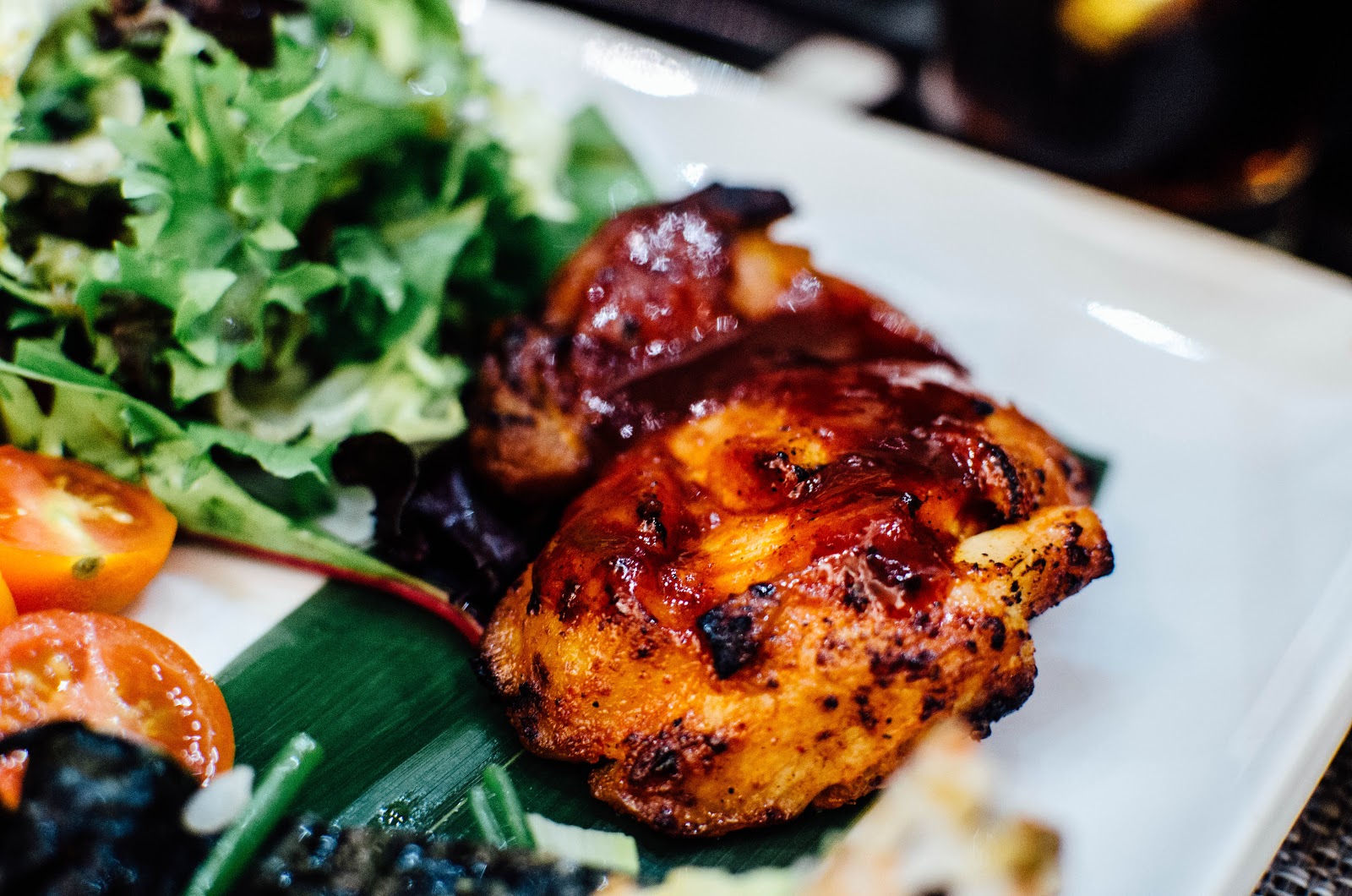 Finally, my meal arrived and looked so scrumptious sitting on my plate. I went for the Chicken Medallion which is chicken in a spicy BBQ sauce with sticky rice and salad; aswell as a few spicy cherry tomatoes and sweet potato fries.