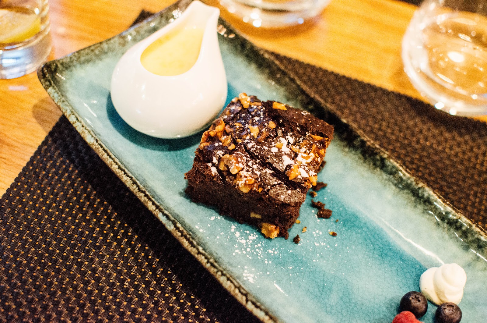 A warm chocolate brownie with walnuts, clotted cream and a blood orange and star anise custard was presented to us. We poured the custard, letting it settle around the brownie in a puddle of goodness. It was certainly a very naughty treat and I hate to think how many calories was consumed, but boy was it worth it!