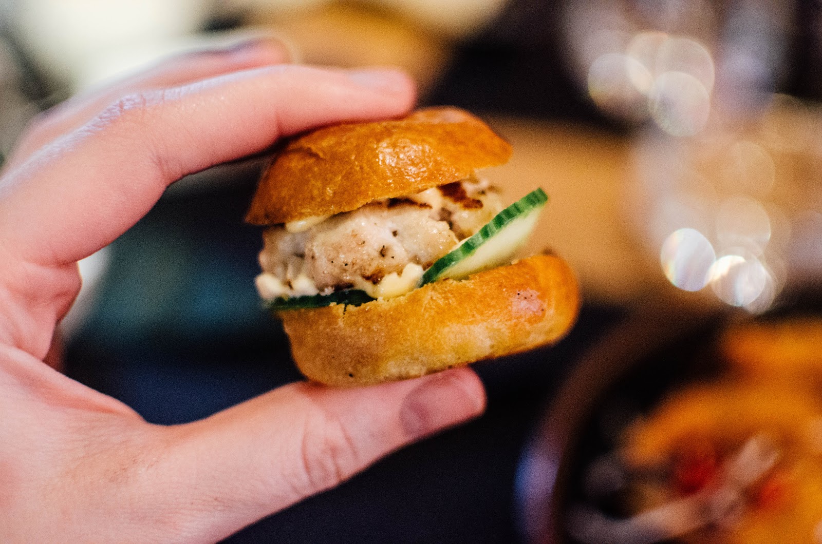 Next, was the minced turkey sliders or really the mini turkey burgers. These were ADORABLE. Look how small they are! These were garnished with pepper and a creamy mayonnaise-like sauce on top. Really nice and satisfying for something so small.
