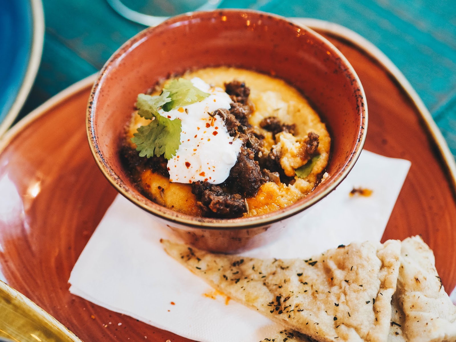 We ordered three dishes from the tapas menu for starters and was very excited for these to arrive at our table. We ordered individually but shared them around. My mum went for the Baked Topped Houmous; topped with spicy beef, cumin seeds, yoghurt and presented with some flatbread pitta. Delicious.