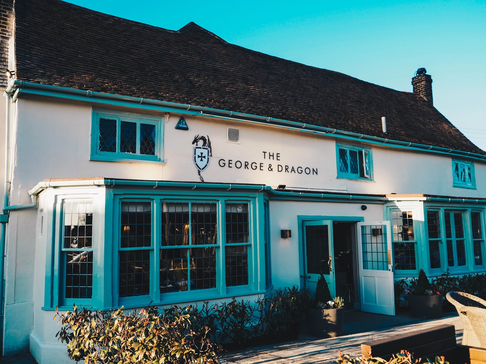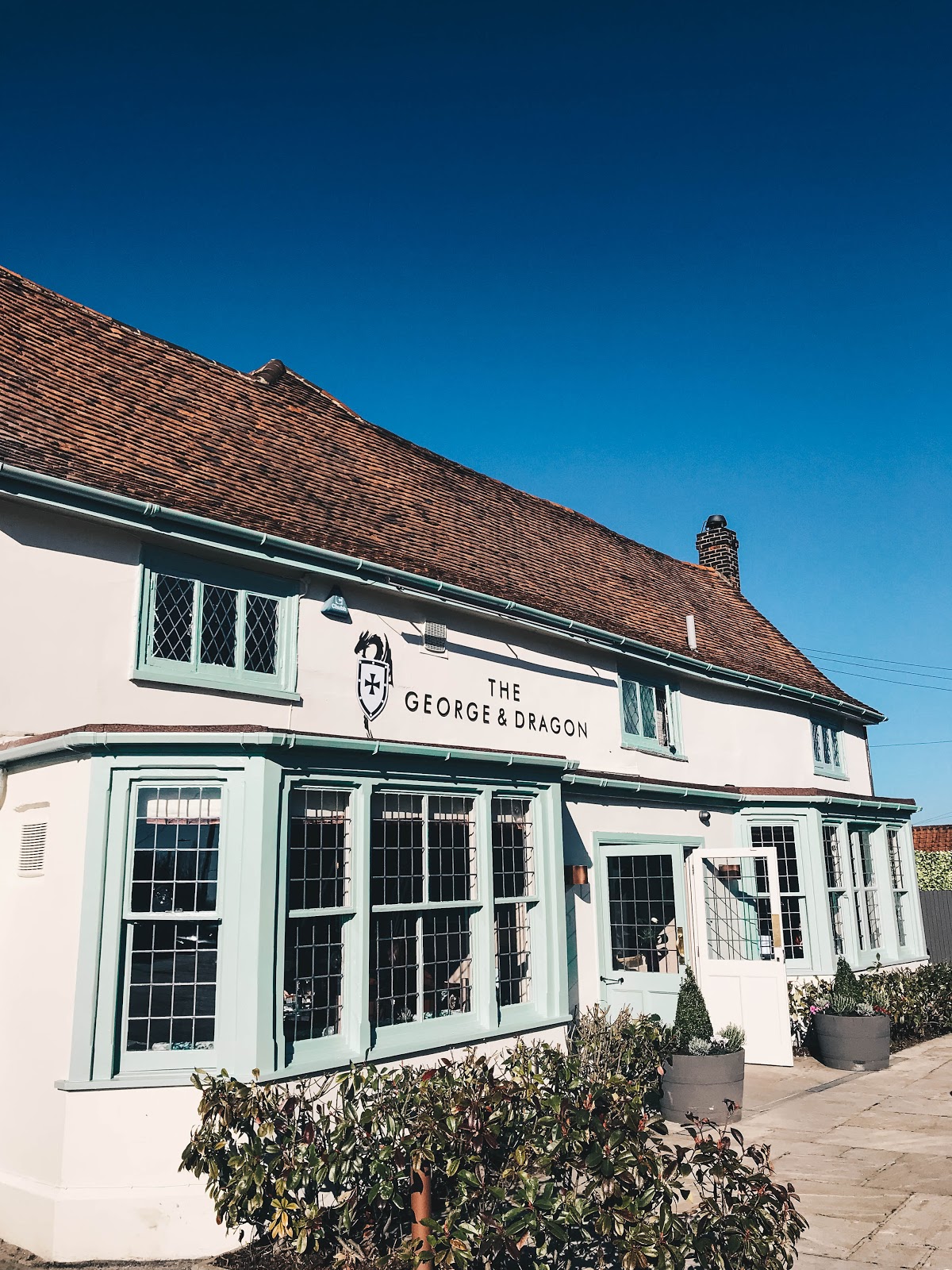 Upon pulling into the on-site car park, The George and Dragon is a simple looking magnolia coloured town house with gridded window panes and duck egg painted window frames. Very cute.