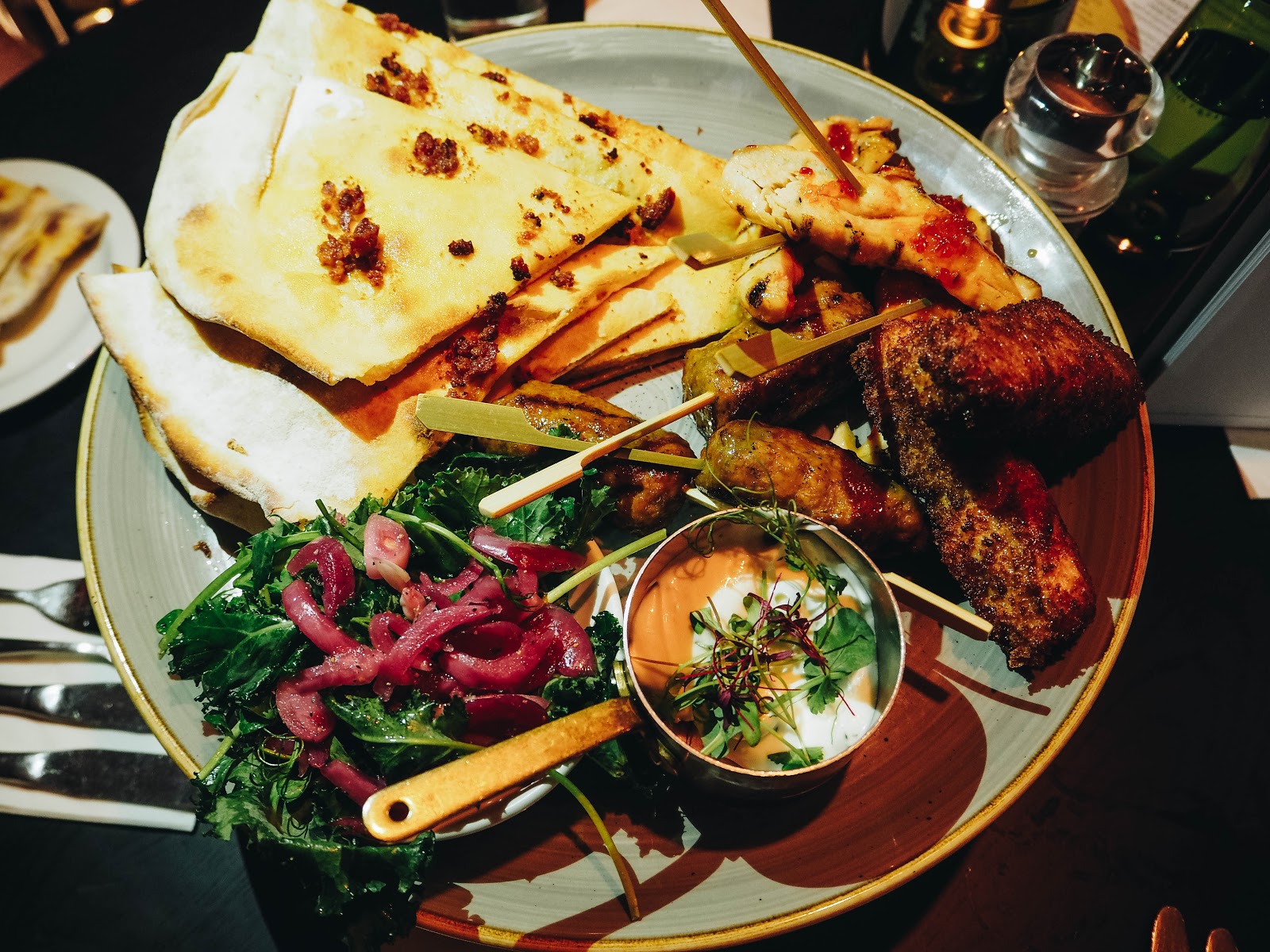 To start, we decided to order the Grazing Platter (£16.95) to share as a beginning 'nibble starter', as everything that it came with was something we both liked. It came with minted lamb and balsamic koftas, sweet chilli chicken skewers, pulled pork croquettes and aioli and chorizo topped flatbread.