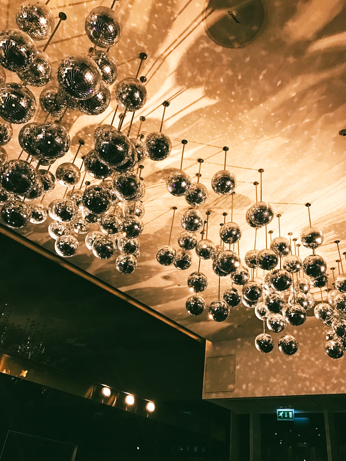 very own bar, photo booth, giant disco balls hanging from the ceiling, DJ booth