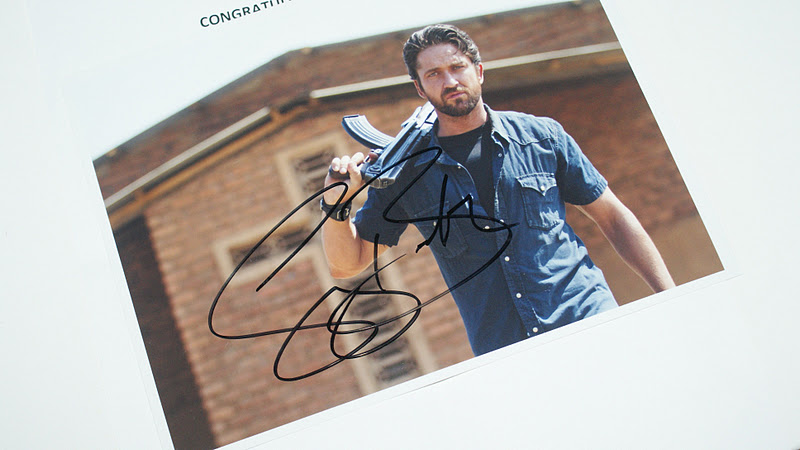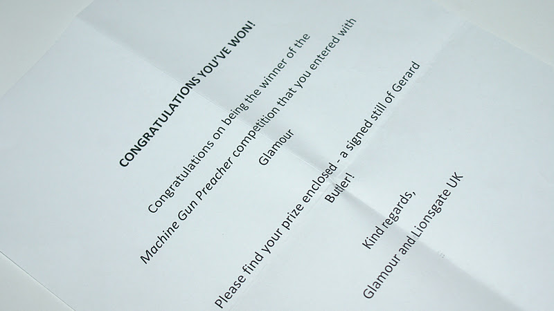 Yes, I won another competition. If you're a new follower (hello by the way!) then you should know that I enter a lot of competitions and giveaways and I've won quite a few over the past three months. This is the most exciting one though! It was a competition on Twitter run by Glamour Magazine to win a signed still by GERARD BUTLER for his new film 'Machine Gun Preacher. There was two overall winners; myself and another lucky lady!