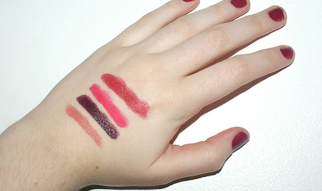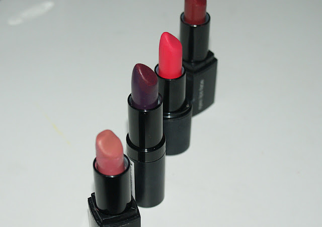 LEFT TO RIGHT: elf nicely nude, kate moss' #04, sleek heartbreaker & elf cheerful cherry