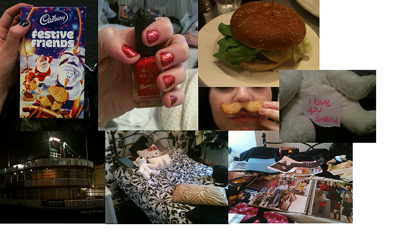 festive biscuits for lunch / red glitter by barry m - removing it is the bane of my week! / two trips last week to the gourmet burger kitchen, even got recognised by the American waiter, woops! / found a mostache shaped wedgie / todd leaves me notes in my room when he goes home, cute / my favourite restaurant in outer town has closed down, boo! / actually tidied my room the other day / college work has been the bane of my MONTH!