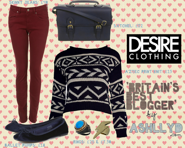 I chose the jumper because I immediately fell in love with the pattern. Aztec and tribal patterns are on trend and everywhere at the moment; such as asos and topshop (click the link for direct aztec pieces!). I also noticed how it's a crop jumper, so it's a great piece to have as you can layer it over other things - and layering is a must this A/W! I have paired the jumper with an outfit I would personally wear. I love these jeans and even though they're a little pricey at £40, I think they're worth it. I found the shoes on topshop aswell (surprise, surprise!). I would only wear flats with this outfit (i never wear heels!) and I was looking for a ballet pair. These are also velvet which adds that slight romantic yet casual feel to the whole outfit. I chose this satchel bag as they've been on trend for absolutely ages and I don't think they'll be going "out" anytime soon! I purposely made sure to find a bag that matched the shoes, yet still tied in with the navy/red/cream colour scheme. I wouldn't wear much jewellery with this outfit, simply because the pattern is very "in your face" so I have chosen two rings that would add a little something extra to a casual but interesting outfit.