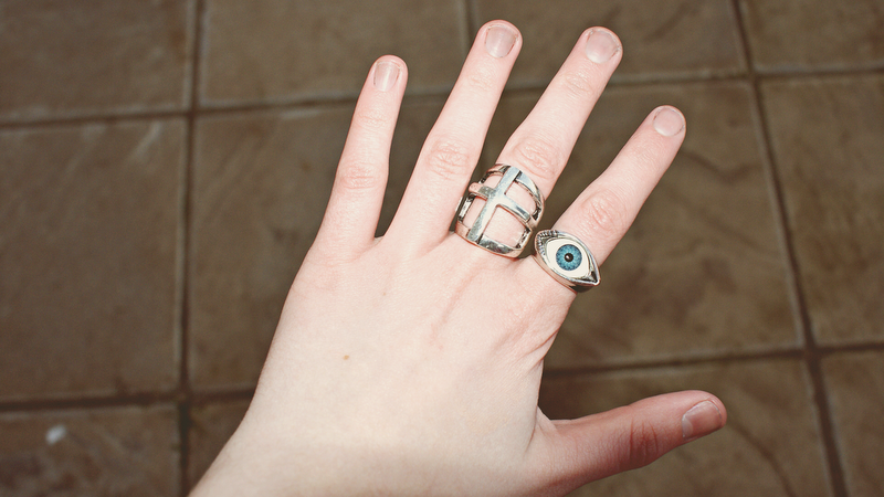jewellery: cross cage ring* (covet jewellery) + topshop evil eye ring