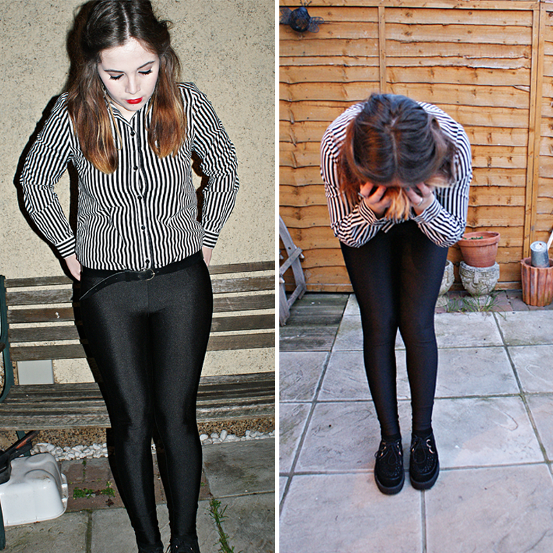 Haven't worn this shirt in ages. Everytime I dig it back out I fall in love all over again and then I happen to forget about it for another couple of months! Haven't worn my ~disco pants in quite a while. I still need to get round to wearing my new red pair! My leg looks weird in the left photo but if you look carefully it's the shadow behind my leg. That's what I get for photographing my outfit at dusk. I was debating whether to post these or not. I hate flash but I really wanted to blog a new outfit. Must photograph with daylight!