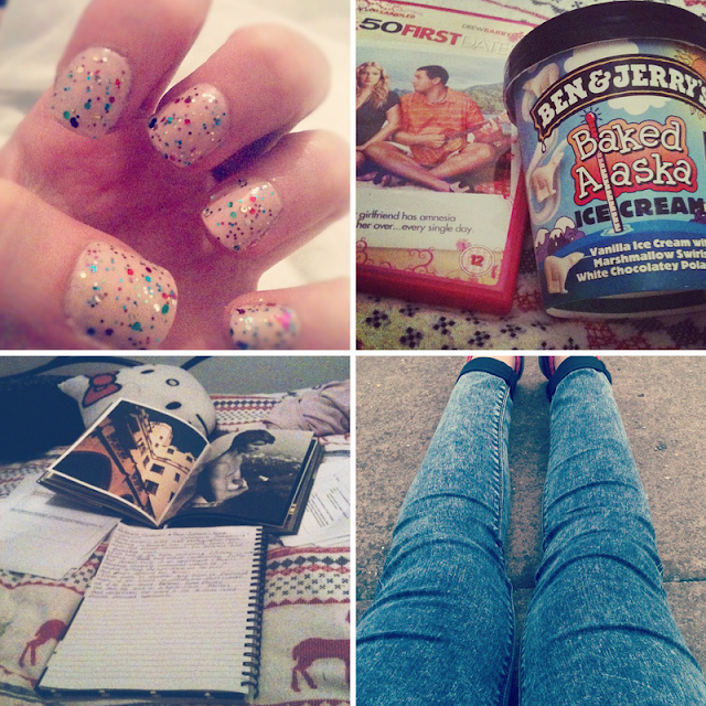 1) I've kinda procrastinated over the past three weeks and left starting my three Uni assignments until this week (may i mention I begin the forth week tomorrow 01/10!). I have two practical projects which involve thinking of an idea, shooting, printing and presenting and the other is an essay. I'm so undecided on one of the projects but I need to get my bum into gear cos time will soon creep up on me!cute nails: elf's 'innocent' base-coat + technic's 'carnival' glitter top-coat · film night.. for one! · uni work has started · wore jeans for the first time in years!