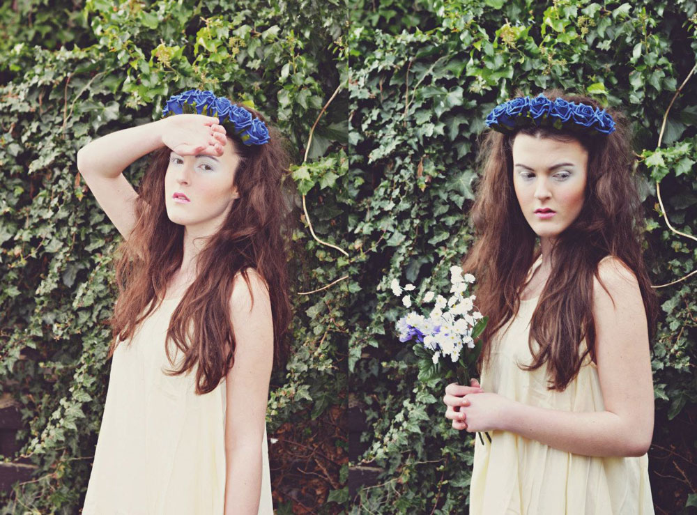 I decided to use floral head crowns supplied by the lovely Crown & Glory and use my sister as the model for the whole project! She is quite tall, with a pale complexion and long hair. When testing my ideas, she reminded me of a cherub so I went along with that theme and here are the test shot outcomes. I'm really happy with these! The only things I changed for the final shoot was the colour of the head crown and the location.
