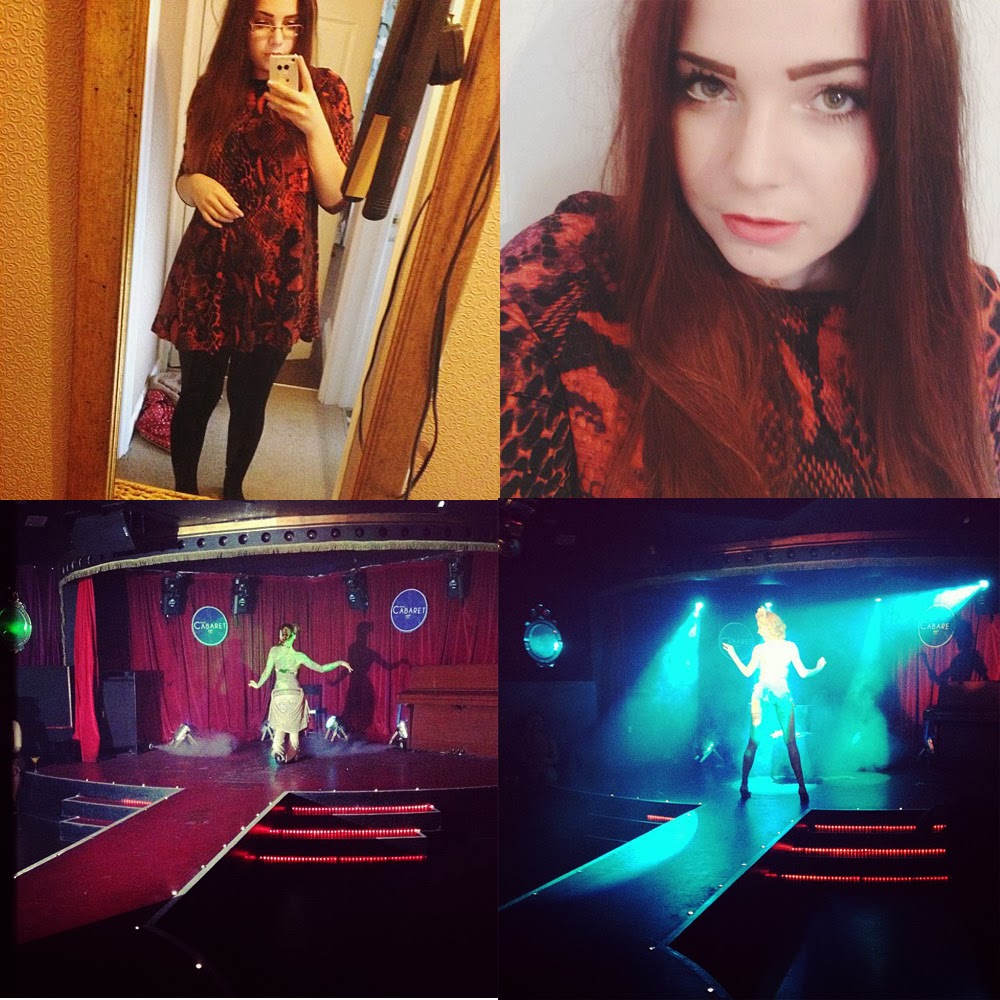 I finally met the babes Islay and Sam at Tower Hill Station and then we walked to the venue which was Proud Cabaret; luckily only a five minute walk. We bumped into Lauren and had a little catch up whilst meeting Rhea and finally after years of reading her blog; Kayla! Upon entering the venue we was told to take the staircase going down until we reached the seductive, smokey and dark room where it all went on. The first thing we all saw was little waitresses walking around in french knickers and stockings. Quite the shocker! As soon as we all entered we was given a cocktail which was lovely and fruity! And then me Lauren & Islay got our photo taken :)