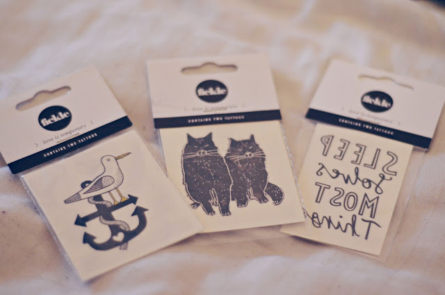 I'm a bit of a chicken when it comes to the subject of tattoos. I'm indecisive and really wouldn't want to regret a tattoo the day after getting it done! Temporary tattoos are a god send so huge thanks to the guys at Fickle sending me some. The quote "Sleep Solves Most Things" has a personal relevance to me so I can't wait to apply that one. I tried out the seagull one today and love it. It's not really my style but I think the heart in the anchor adds some cuteness to it!