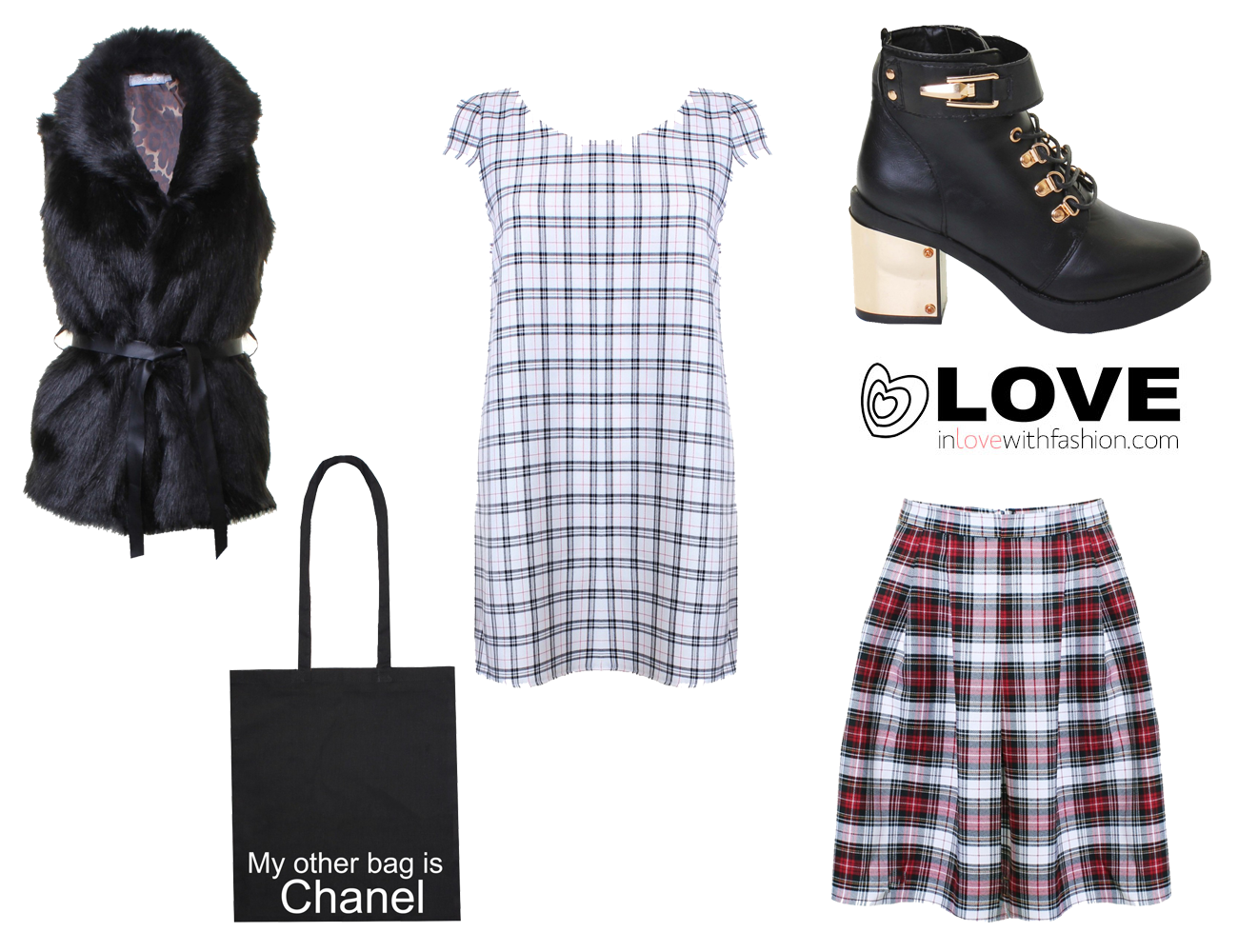 Tartan Dress | Tartan Skirt | Tote Bag | Gold Heel Boots | Faux Fur Gilet