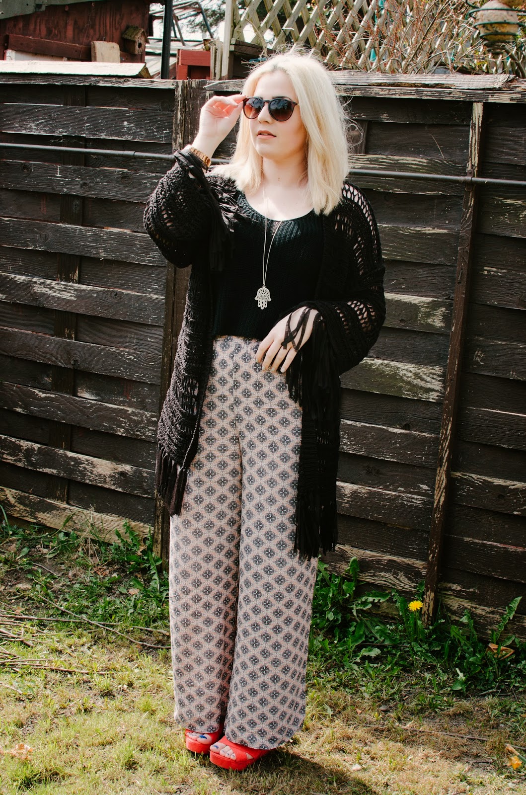 Wearing: Top: Primark | Wide trousers: H&M (here) | Crochet kimono & watch: ASOS | Sunglasses & Shoes: Primark | Bag: Urban Outfitters (here) | Necklace: Gemma Malster* (here)